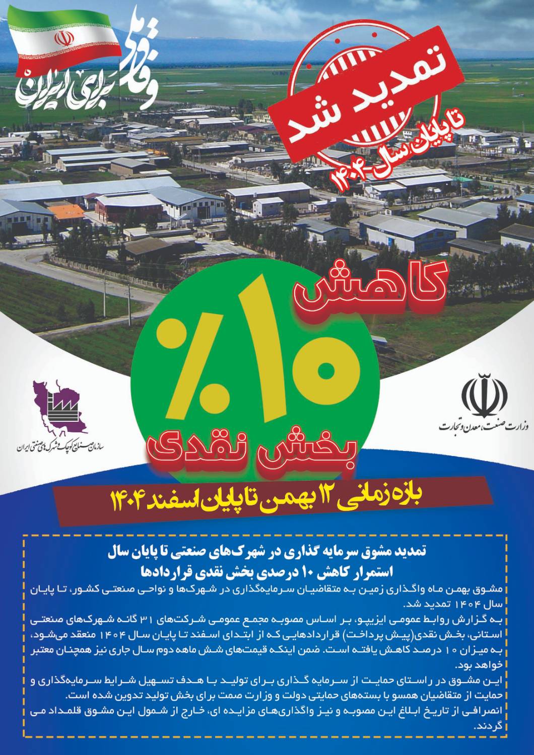 به گزارش روابط عمومی ایزیپو، بر اساس مصوبه مجمع عمومی شرکت‌های 31 گانه شهرک‌های صنعتی استانی، بخش نقدی(پیش پرداخت) قراردادهایی که از ابتدای اسفند تا پایان سال 1404 منعقد می‌شود، به میزان ۱۰ درصد کاهش یافته است. ضمن اینکه قیمت‌های شش ماهه دوم سال جاری نیز همچنان معتبر خواهد بود.