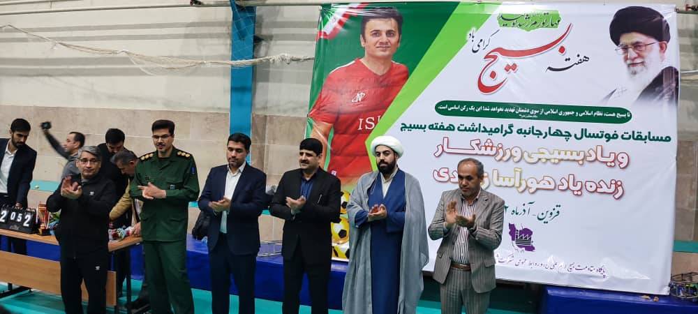 به گزارش روابط عمومی سازمان صنایع کوچک و شهرک‌های صنعتی ایران، مسابقات فوتسال چهارجانبه گرامیداشت هفته بسیج و یادواره بسیجی ورزشکار " زنده یاد هورآسا زاهدی " با حضور تیم‌های فوتسال سازمان صنایع کوچک و شهرک های صنعتی ایران، صندوق ضمانت سرمایه گذاری صنایع کوچک ایران، شرکت شهرک های صنعتی استان تهران و قزوین به میزبانی قزوین در روزهای یکم و دوم آذرماه برگزار شد.