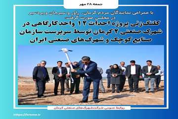 با حضور سرپرست سازمان صنایع کوچک و شهرک‌های صنعتی ایران و همراهی نماینده مردم سیرجان در مجلس شورای اسلامی، پروژه احداث ۱۲ واحد کارگاهی در شهرک صنعتی ۲ کرمان کلنگ زنی شد.