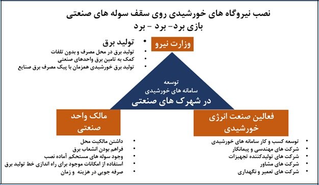 وی نصب نیروگاه‌های خورشیدی کوچک مقیاس روی سقف واحدهای صنعتی را بازی "برد - برد - برد" توصیف کرد و اظهار داشت: اولاً برای واحد صنعتی مفید است، چون سقف سوله‌های صنعتی بلااستفاده و از طرف دیگر از استحکام کافی برخوردار است. همچنین صاحب کارخانه، مالکیت سوله را در اختیار دارد و انشعاب برق نیز از قبل فراهم است. بنابراین مالک واحد صنعتی در کنار تولیدات خود می‌تواند از امکانات موجود واحد برای احداث یک خط تولید جدید به نام "تولید برق پاک" نیز استفاده کند. ثانیاً برای وزارت نیرو نیز "برد" است، چون مقداری از تأمین برق مصرفی صنایع در همان محل واحد صنعتی صورت می‌گیرد و شاهد سرمایه گذارانی هستیم که وارد عرصه تولید برق می‌شوند و دقیقاً در همان محل مصرف، برق تولید خواهد شد؛ به‌خصوص که پیک تولید برق خورشیدی همزمان با پیک مصرف صنایع در ماه‌های گرم سال است و می‌توانند کمک شایانی به "پیک ‌زدایی" کنند. ثالثاً برای کسب و کار فعالان عرصه انرژی خورشیدی نیز بسیار جذاب است و یک مسیر جدید برای توسعه کسب و کار و تولید تجهیزات و فعالیت‌های پیمانکاری و نگهداری و تعمیرات و ... گشوده می‌شود.