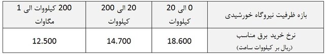داد با تأکید بر این‌که از سال 1394 تا کنون که این نرخ‌ها تعیین شده و چندین بار از جمله در سال‌هاي 1395 و 1398 بازنگری شده است، ادامه داد: اولا پله نیروگاه‌های خورشیدی ۲۰ تا ۱۰۰ کیلووات وجود داشته است که سایز ۱۰۰ کیلووات برای واحدهای تجاری و صنعتی سایز کمی است، و صنایع تمایل دارند که در ظرفیت‌های بزرگتری سرمایه کنند. بنابراین این کارگروه پیشنهاد داد که ظرفیت ۱۰۰ کیلووات به ۲۰۰ کیلووات گسترش یابد که خوشبختانه ساتبا نیز موافقت کرد. در فاصله ۲۰ تا ۲۰۰ کیلووات، اتصال به شبکه به ولتاژ ۴۰۰ ولت انجام می‌شود و از نظر اتصال به شبکه تفاوتی با فاصله قبلی ۲۰ تا ۱۰۰ کیلووات ندارد و مشکل فنی ایجاد نمی‌شود. ثانیا در سال های گذشته برای سایز ۱۰۰ کیلووات تا ۱ مگاوات که رنج مورد استفاده در واحدهای صنعتی است، نرخ جداگانه ای در نظر گرفته نشده است، و بازه فوق همراه با ظرفیت ۱ الی ۱۰ مگاوات بوده است. در نتیجه نرخهای خرید تضمینی تعیین شده همیشه به ضرر سایز ۱۰۰ کیلووات تا ۱ مگاوات بوده و در نتیجه بازه فوق از توجیه پذیری اقتصادی خارج شده است. بنابراین درخواست کارگروه ایجاد بازه ۲۰۰ کیلووات تا ۱ مگاوات و تعیین نرخ جداگانه خرید برق برای این بازه بوده است.