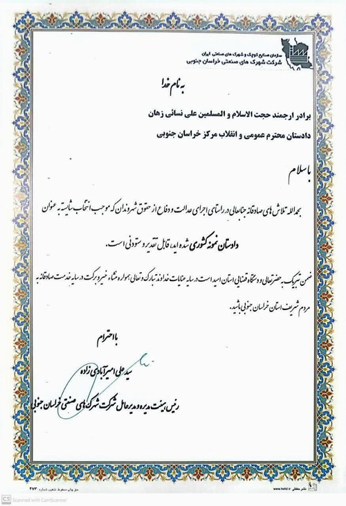 تقدیر مدیرعامل شرکت شهرکهای صنعتی خراسان جنوبی از دادستان مرکز استان / اهدا تندیس قهرمان حامیان تولید به دادستان