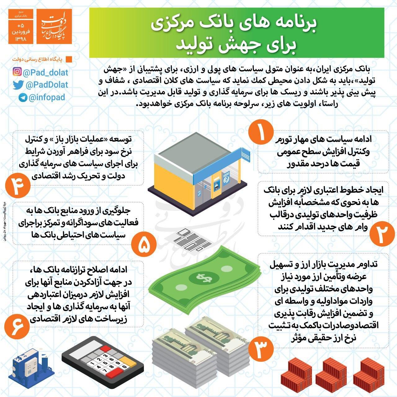 رئیس کل بانک مرکزی از جمله اقدامات لازم برای جهش تولید را برنامه‌ریزی برای پشتیبانی از بانک‌ها به منظور تأمین اعتبار زنجیره تولید، شفاف سازی تراکنش‌های بانکی و توسعه عملیات بازار باز اعلام کرد.