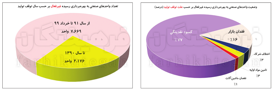 طبق آمار‌های سایت سازمان صنایع کوچک و شهرک‌های صنعتی، تا کنون 48 هزار و 812 واحد صنعتی در کشور به بهره‌برداری رسیده که از این تعداد، حدود 8 هزار و 732 واحد به حالت غیرفعال درآمده‌اند. اما نکته حائز اهمیت علت تعطیلی این واحد‌های صنعتی است. طبق آمارهای سازمان صنایع کوچک و شهرک‌های صنعتی، 'کمبود' نقدینگی علت اصلی این امر به ‌حساب می‌آید که موجب تعطیلی 76 درصد از واحدهای صنعتی شده است. پس از آن، 'فقدان بازار' بیشترین نقش را در تعطیلی این واحد‌ها ایفا می‌کند و عوامل دیگری نیز نظیر 'اختلاف شرکاء'، 'تأمین مواد اولیه' و 'نقصان ماشین‌ آلات' در تعطیلی این واحد‌ها مؤثر هستند.
