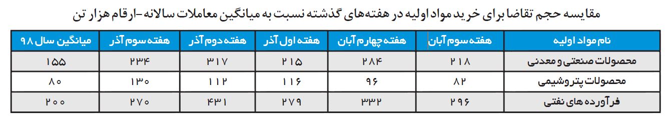 همین رویه در معاملات فرآورده‌های نفتی هم حاکم است، به‌طوری ‌که حجم خرید مواد اولیه در بخش فرآورده‌های نفتی از اواسط آبان تا کنون 120 هزار تن بیشتر از میانگین معاملات سالانه است. این اطلاعات نشان می‌دهد كه میانگین هفتگی تقاضا برای خرید فرآورده‌های نفتی از اول امسال تا کنون 200 هزار تن بوده است که این رقم در طول چند هفته گذشته به‌طور میانگین به 320 هزار تن رسیده است.