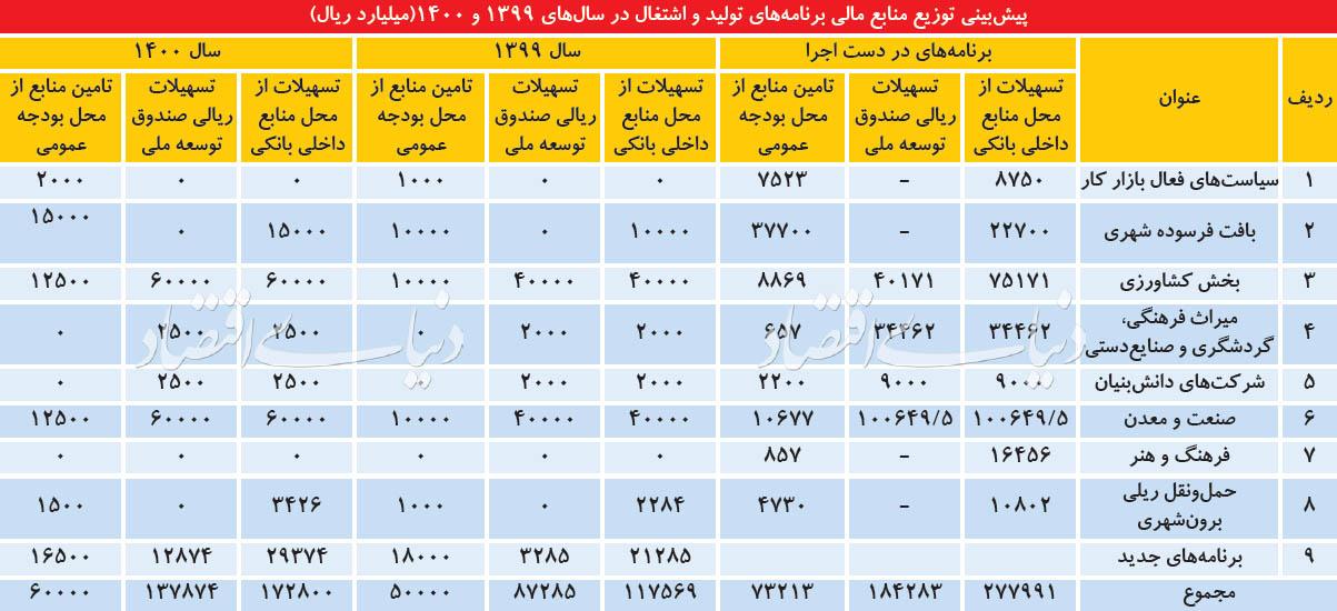 سازمان برنامه و بودجه کشور در برنامه دوسالانه بودجهریزی برای سالهای ۱۳۹۹ و ۱۴۰۰، پیشبینیای برای توزیع منابع مالی برنامههای تولید و اشتغال داشته است. بر اساس برنامهریزی انجام شده، پیشبینی شده است که از منابع بودجه عمومی کشور در سال آینده ۵ هزار میلیارد تومان برای اشتغالزایی و تولید اختصاص پیدا کند. علاوه بر این، منابع تسهیلات ریالی صندوق توسعه ملی حدود 8.7 هزار میلیارد تومان و حداکثر تسهیلات از محل منابع داخلی بانک 11.7 هزار میلیارد تومان درنظر گرفته شده است.